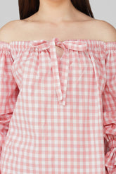 Turn up the charm with this Baby Pink Gingham Off-Shoulder Top – a dreamy combo of vintage picnic vibes and modern cuteness. The -off shoulder top features full-length sleeves with layered ruffle cuffs and a dainty front tie-up detail. This top is made for twirling through summer in style.