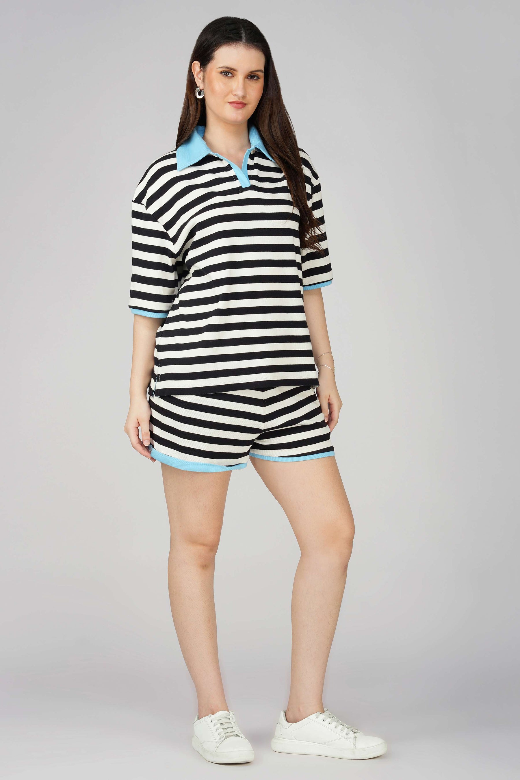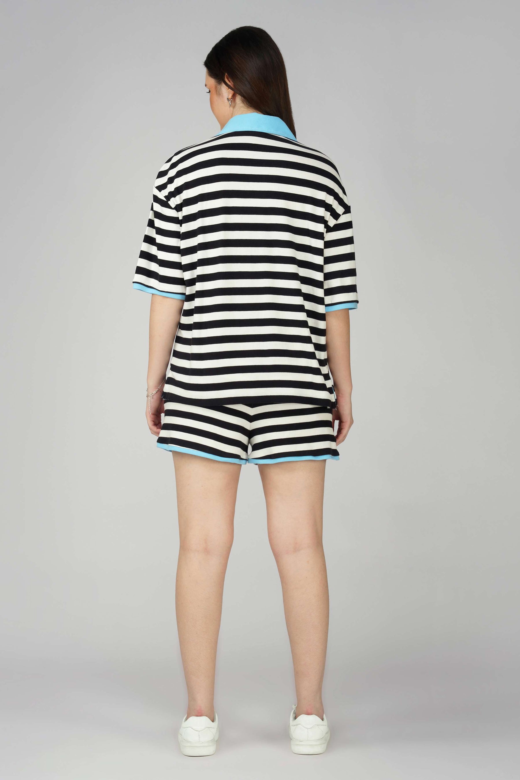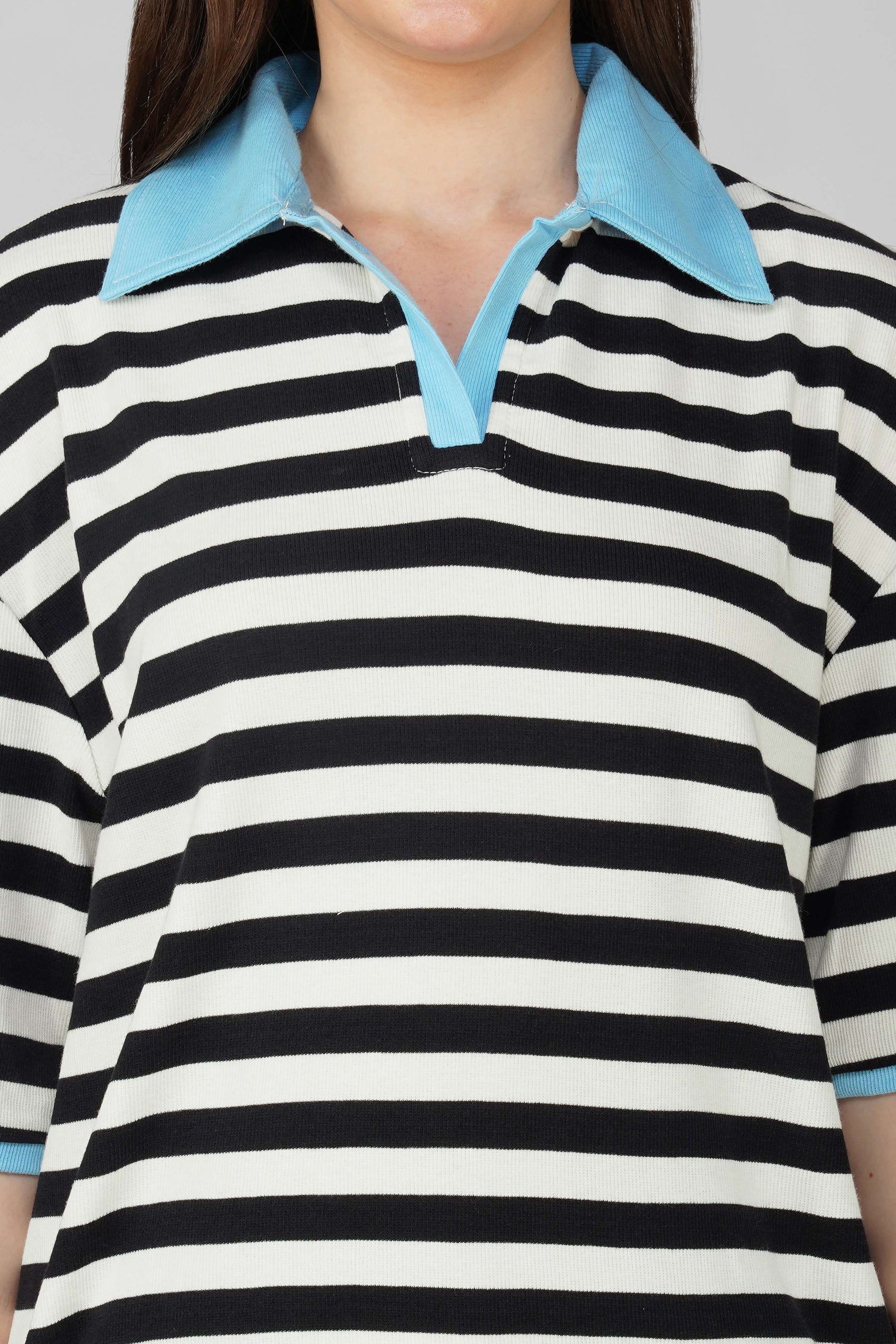 Add a sporty spin to your streetwear wardrobe with this Black and White Striped Polo T-shirt – a comfy-chic blend that screams effortless cool. The oversized polo T-shirt features a structured baby blue collar and sleeve piping, giving a bold pop of color to the timeless stripes. This T-shirt is crafted from soft, breathable cotton for all-day wear.Length: Hip-length