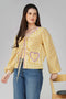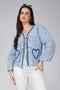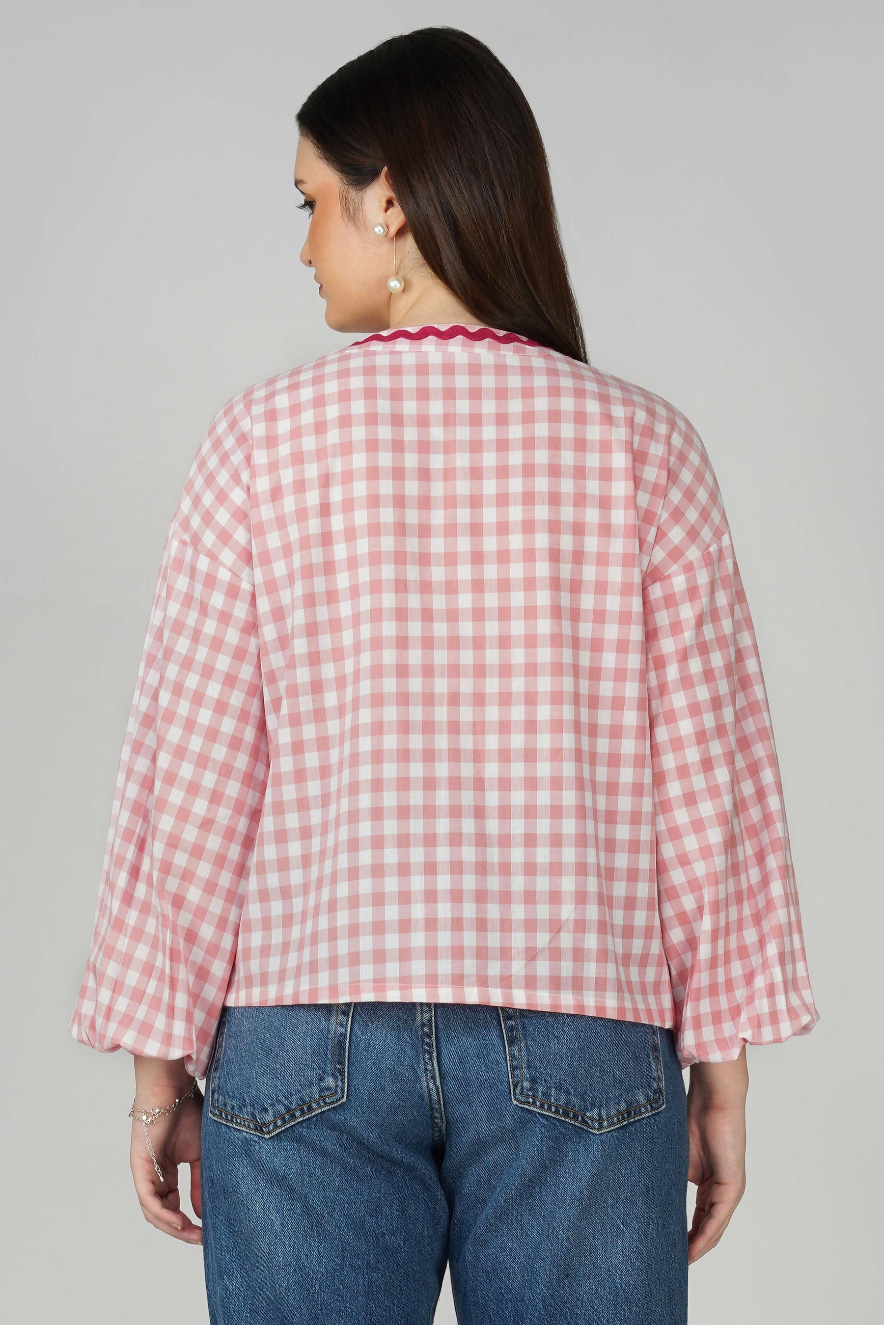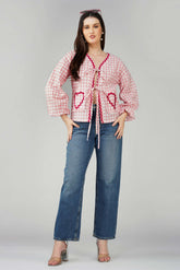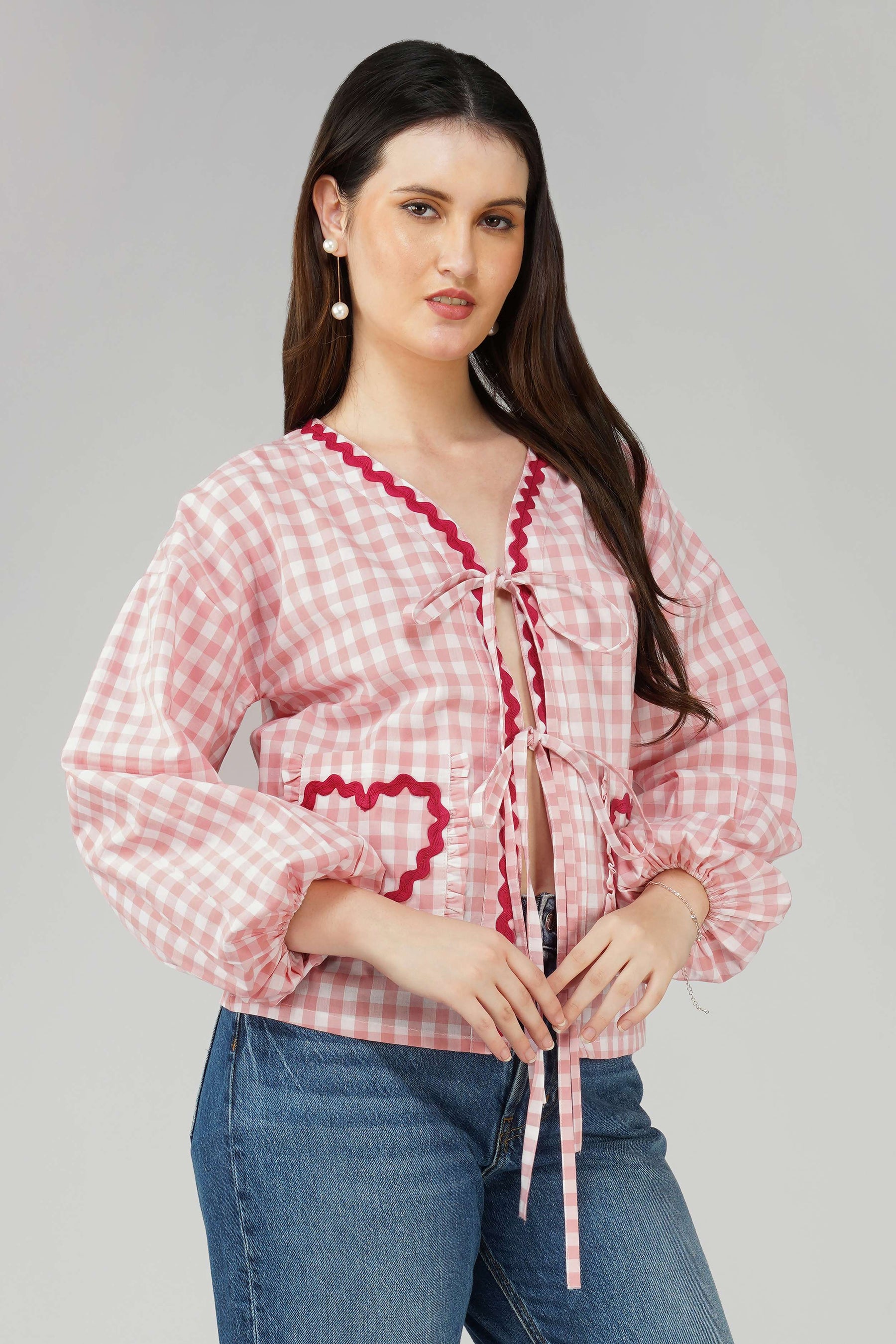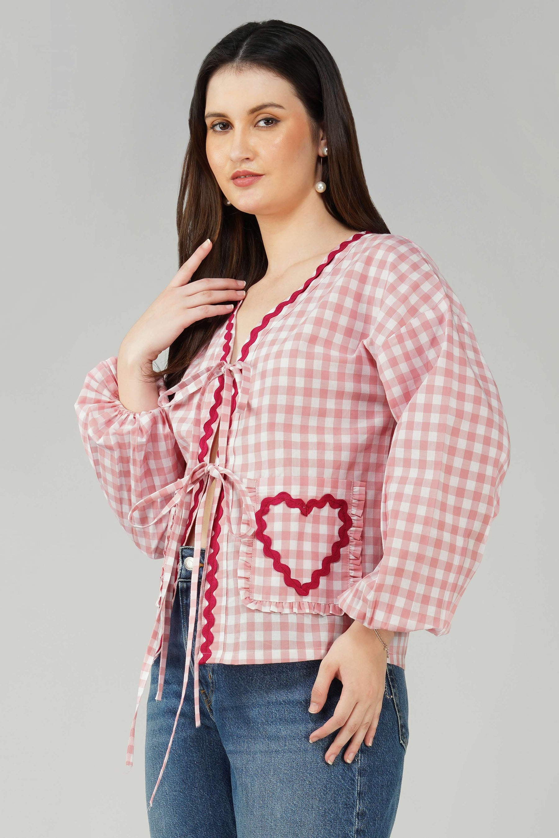 Elevate your wardrobe with our Heart Applique Shirt Top. The charming gingham style, front tie-up, and blouson design exude elegance and femininity. The delicate heart applique contrast lace adds a touch of romance. Perfect for a sophisticated and stylish look.
